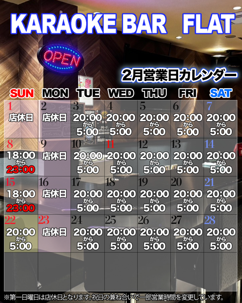 2026年2月の営業カレンダー