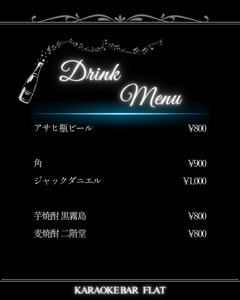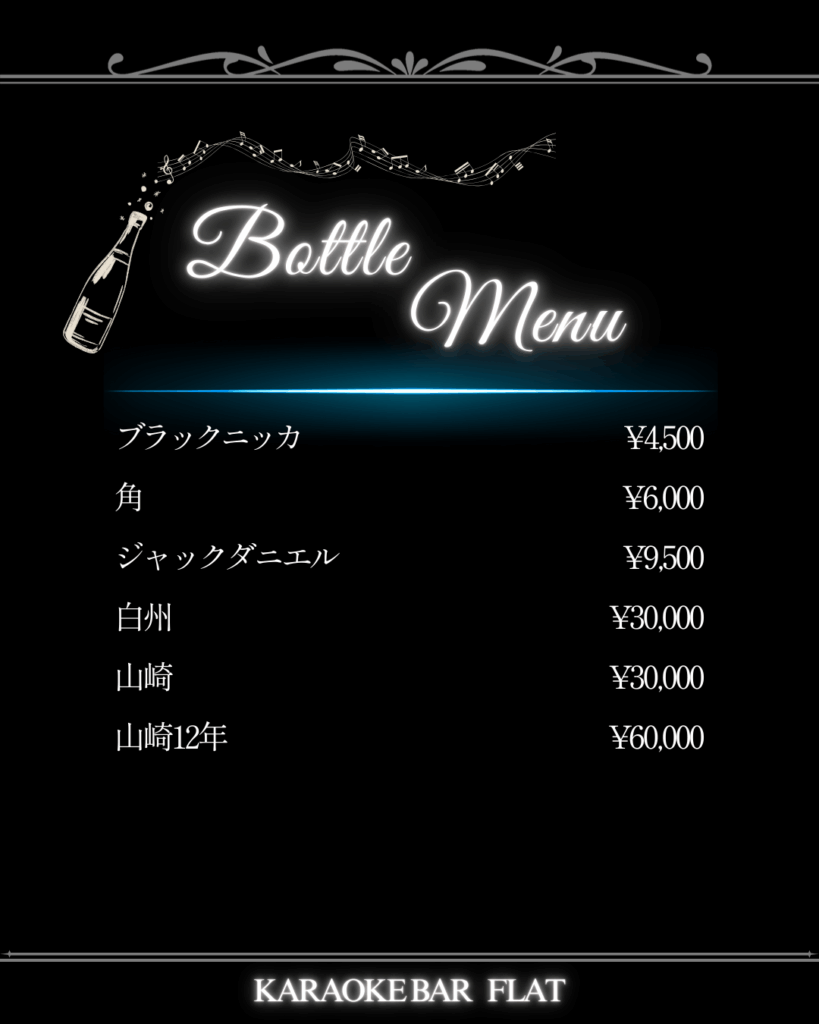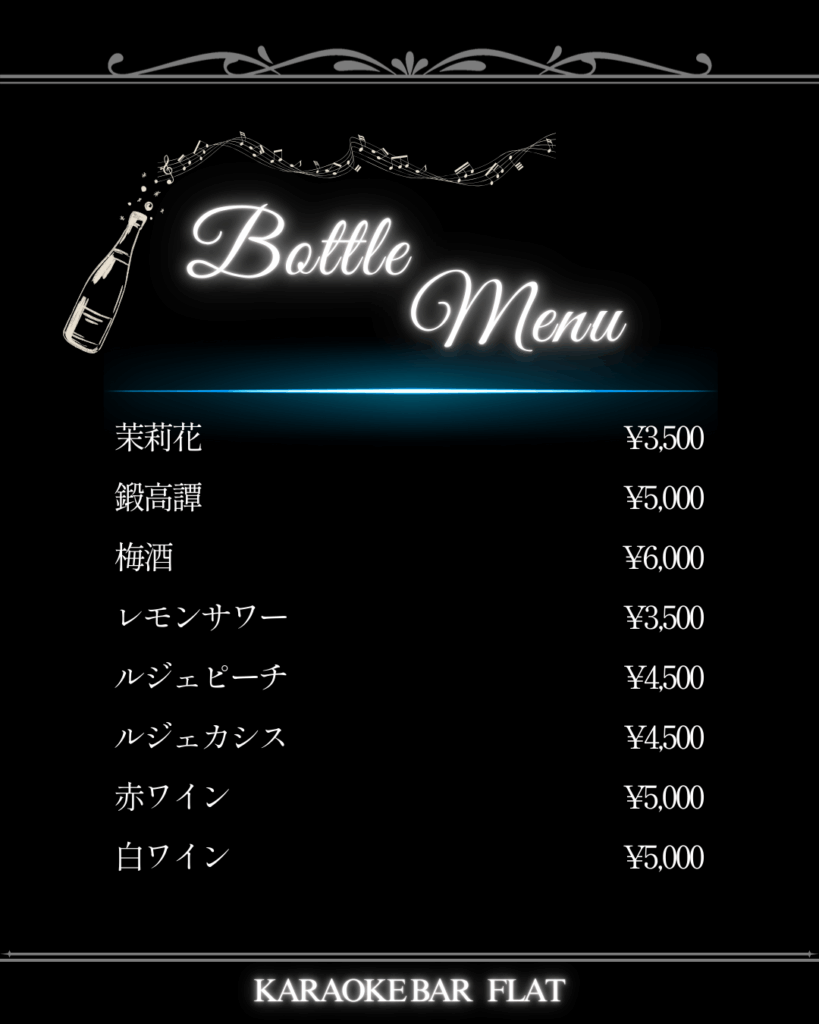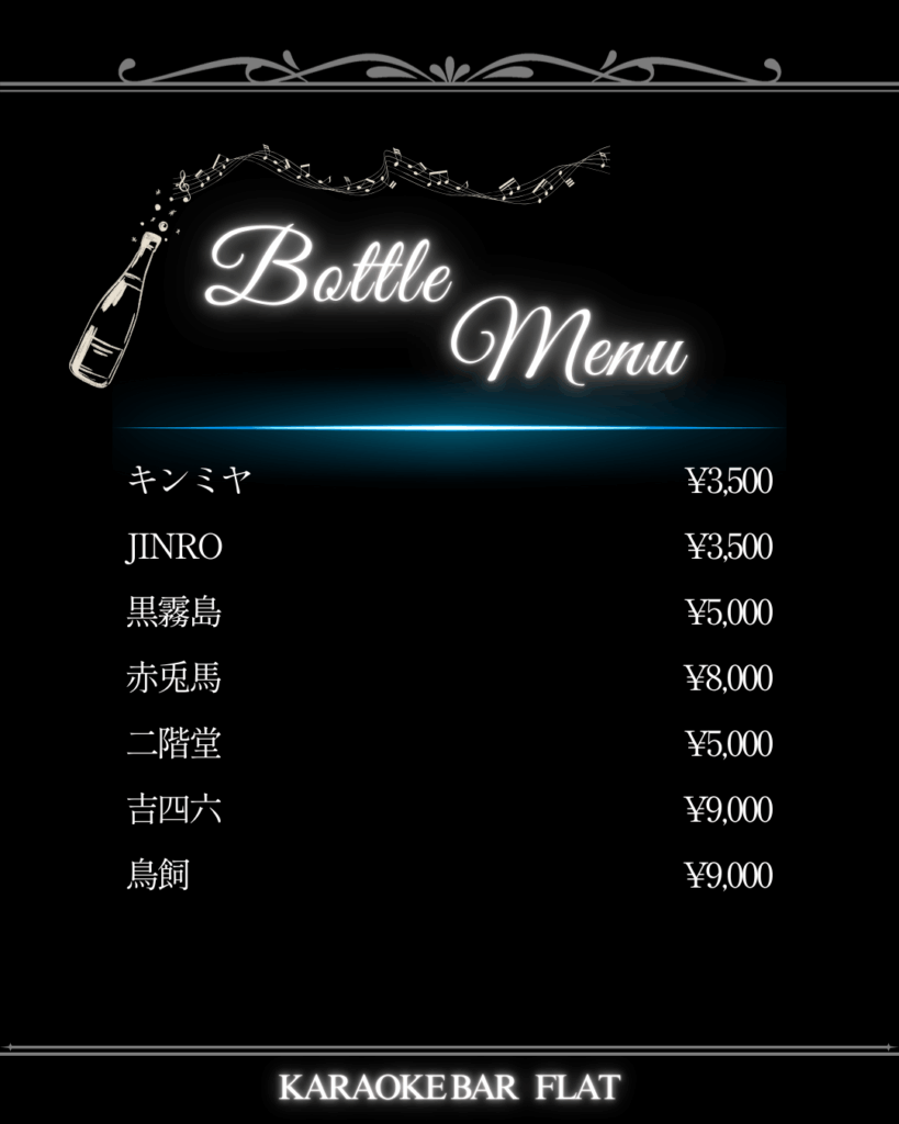 このプランの最大の魅力は時間無制限で歌い放題になることです。お好きなボトルを選んで好きな割りものでご自身のペースで割って飲んで頂けます。もちろん一緒に来た方とシェアして頂けます。ボトルの料金は3500円からとなり、割りものはデキャンタでの提供で1000円、アイスが200円です。料金は飲む分が加算されるだけなのでコスパ良く時間を気にせずに過ごして頂けます。ボトルが残った場合は次回以降にキープさせて頂きます。キープボトルがある場合の料金は男性の方は2700円から、女性の方は1200円から時間無制限で歌い放題をお楽しみ頂けます。